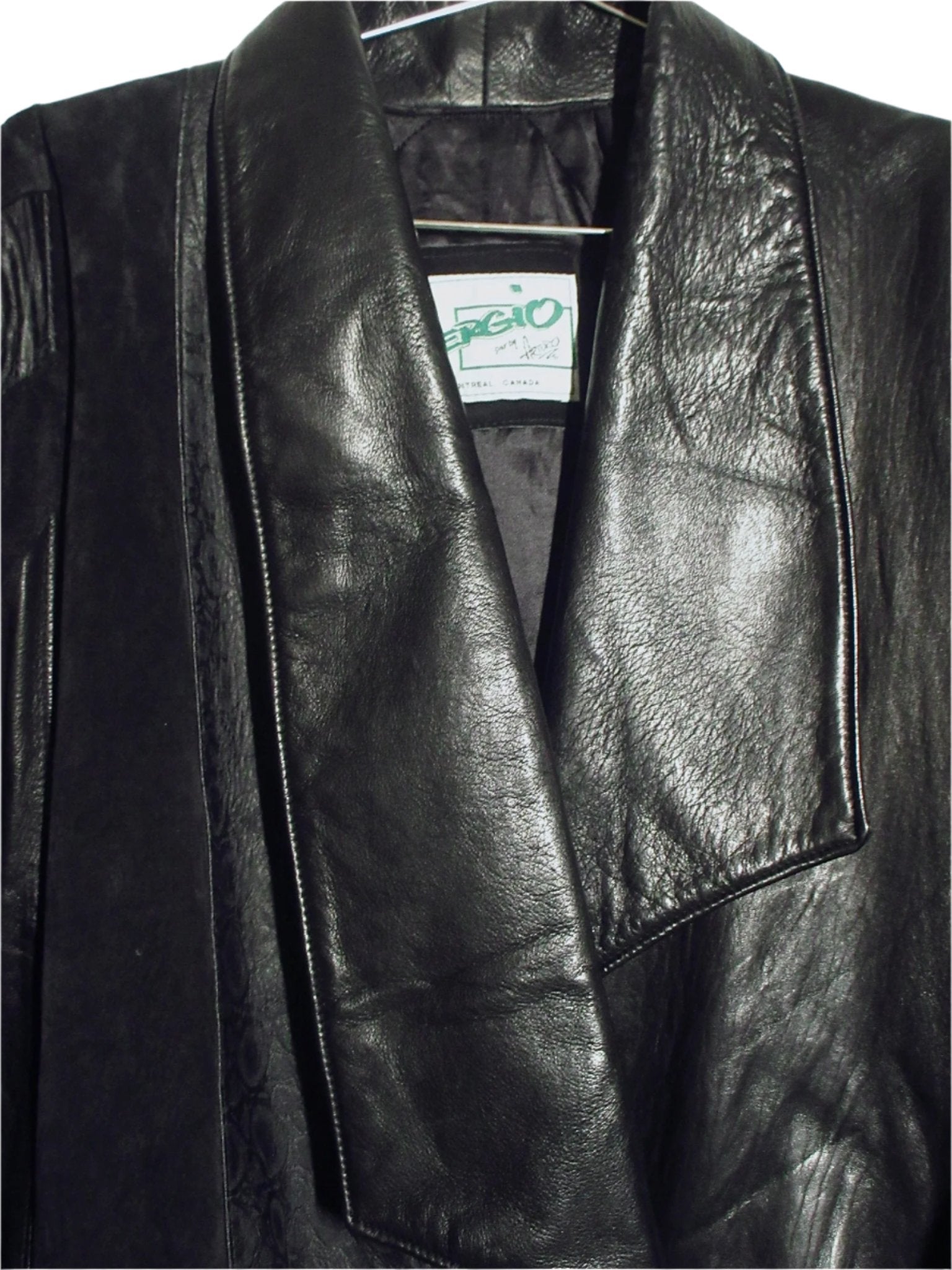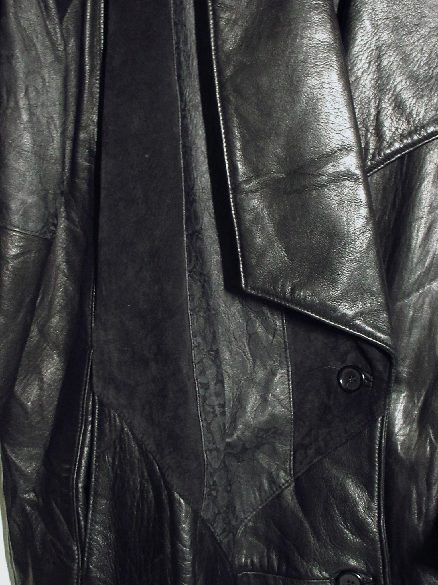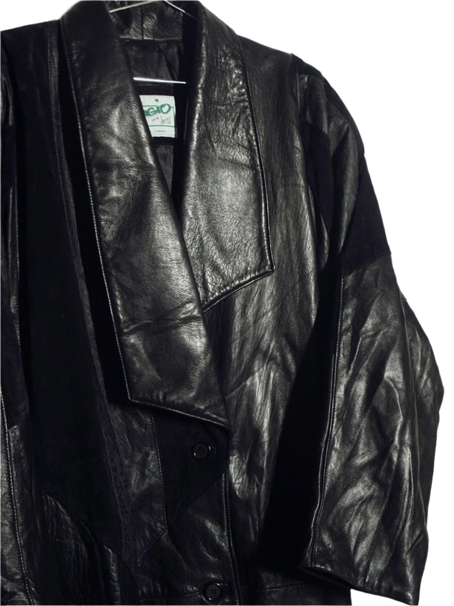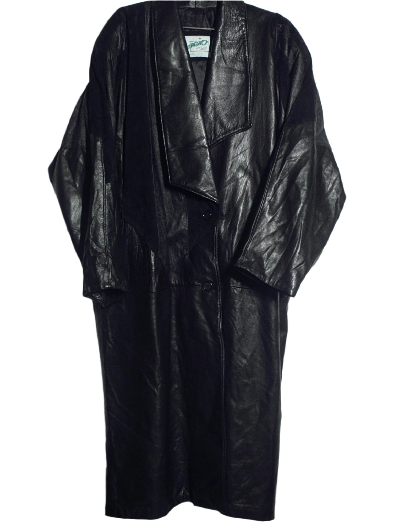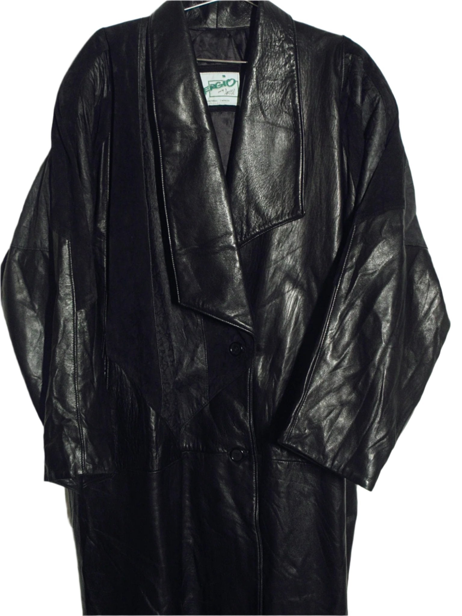Heavyweight leather trench with soft suede paneling, featuring an oversized shawl collar, double-button closure, and a relaxed longline silhouette. The mix of textures and sturdy construction gives it a bold, timeless appeal.