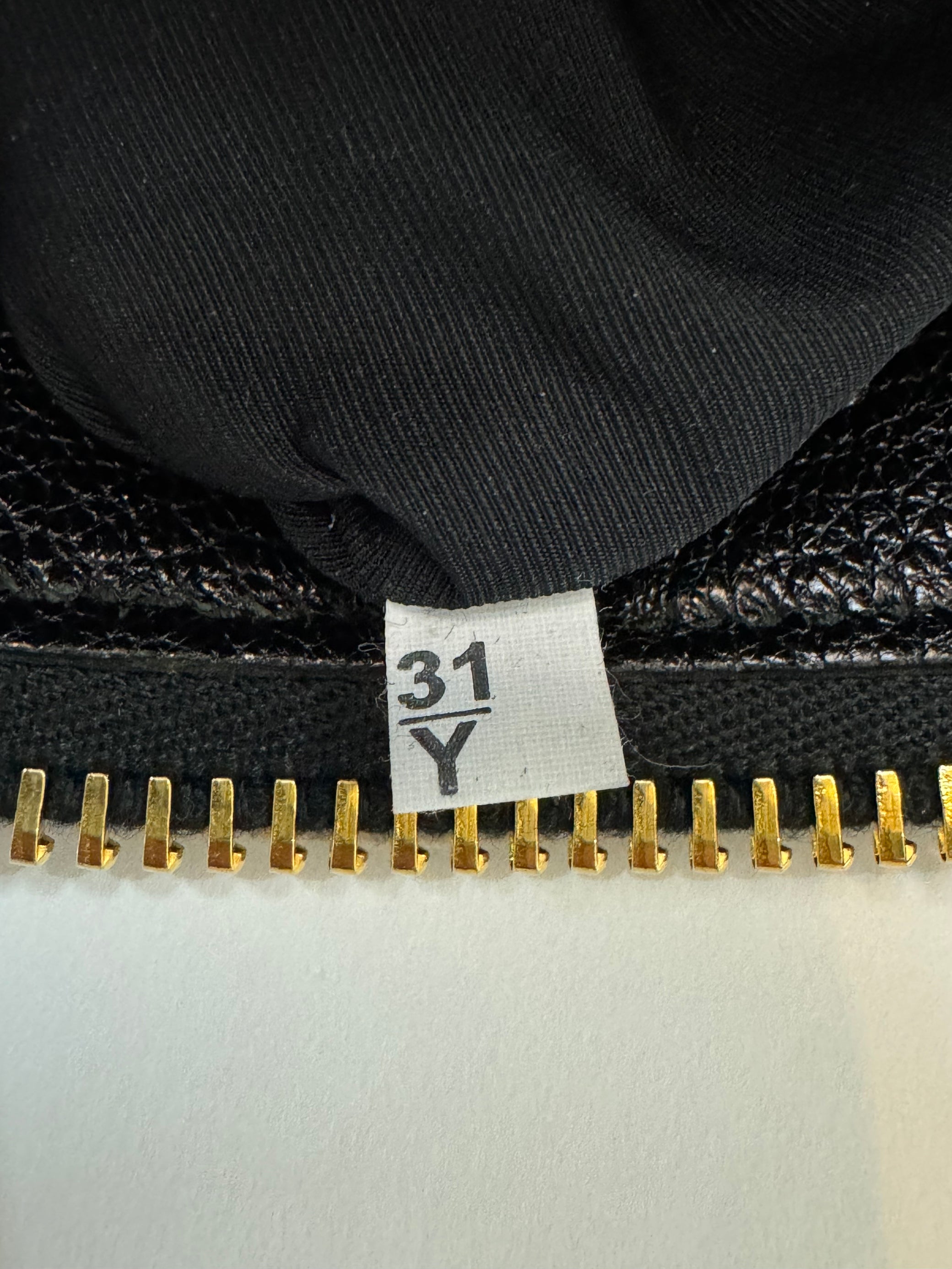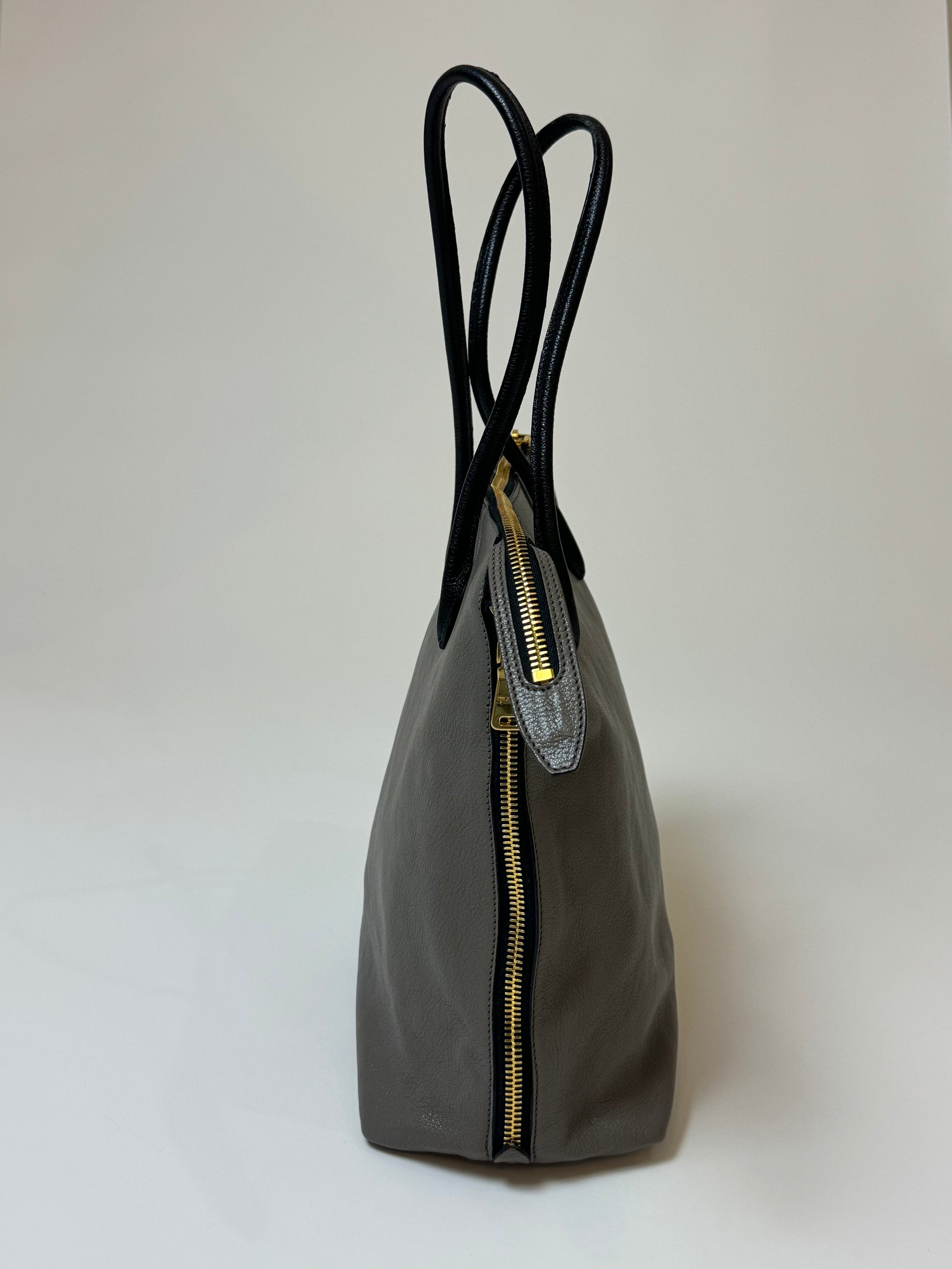 Designed from iconic Vitello Daino leather, featuring gold hardware with zipper closure at top opening and sides for added expansion. Compartmentalized interior features leather pockets including side zipper pocket.