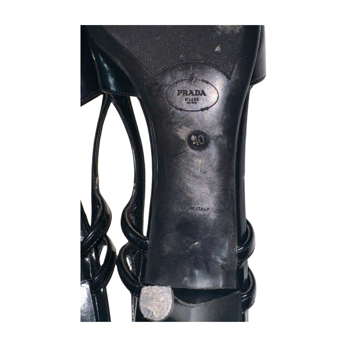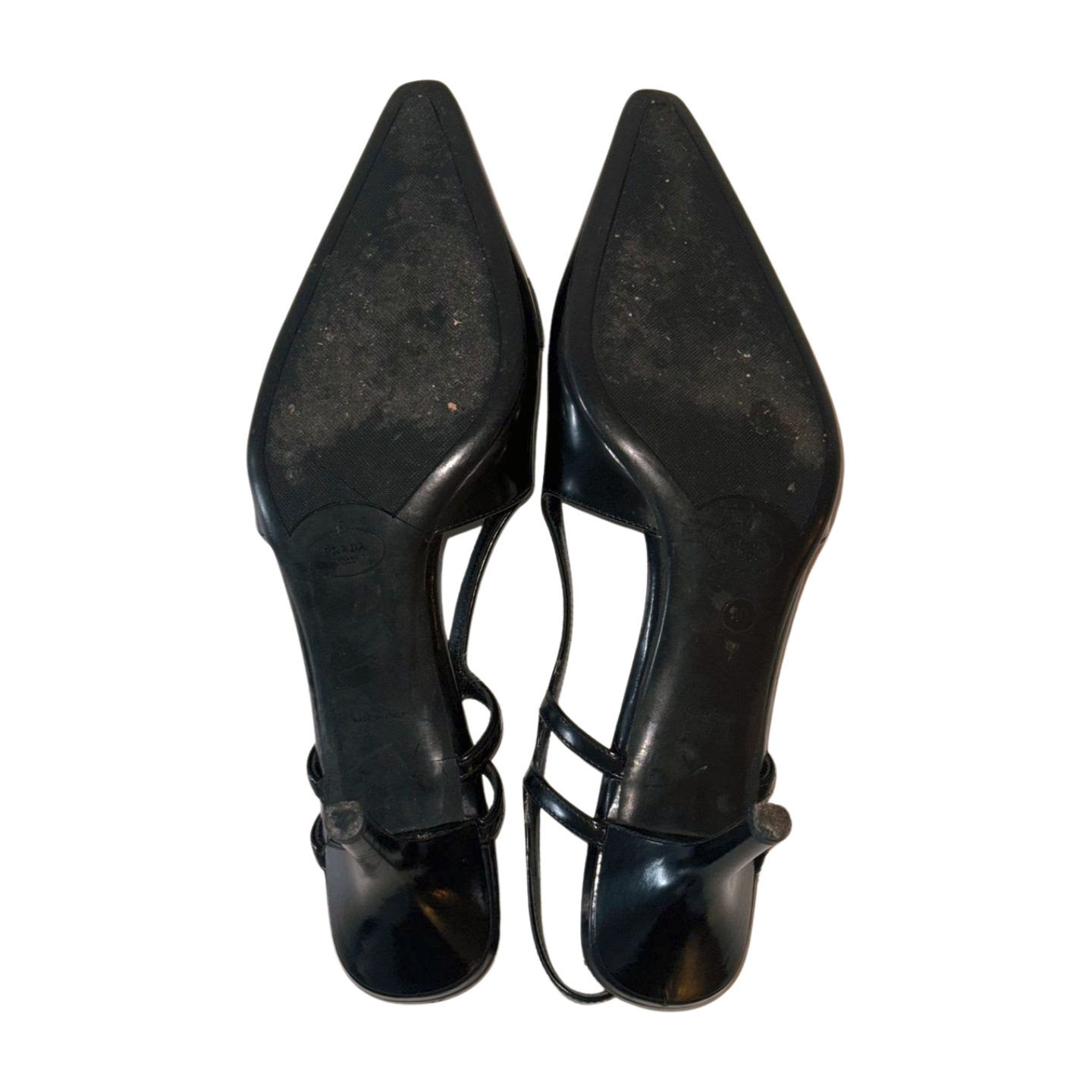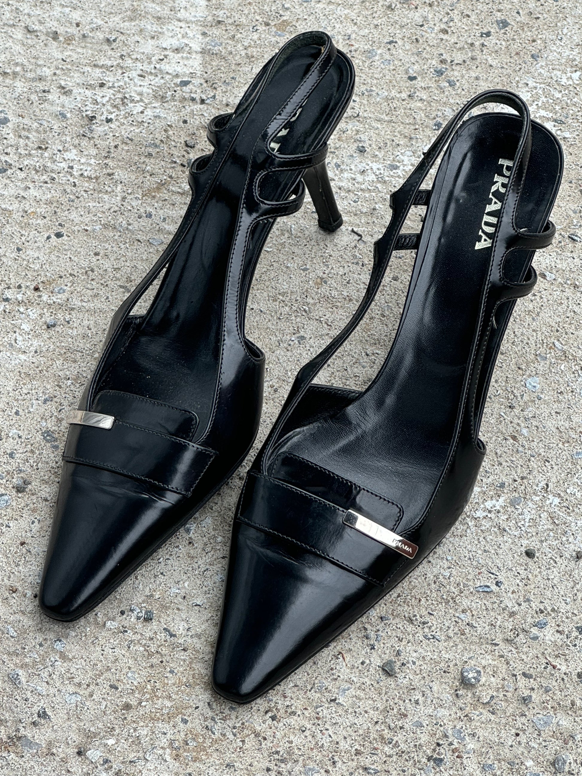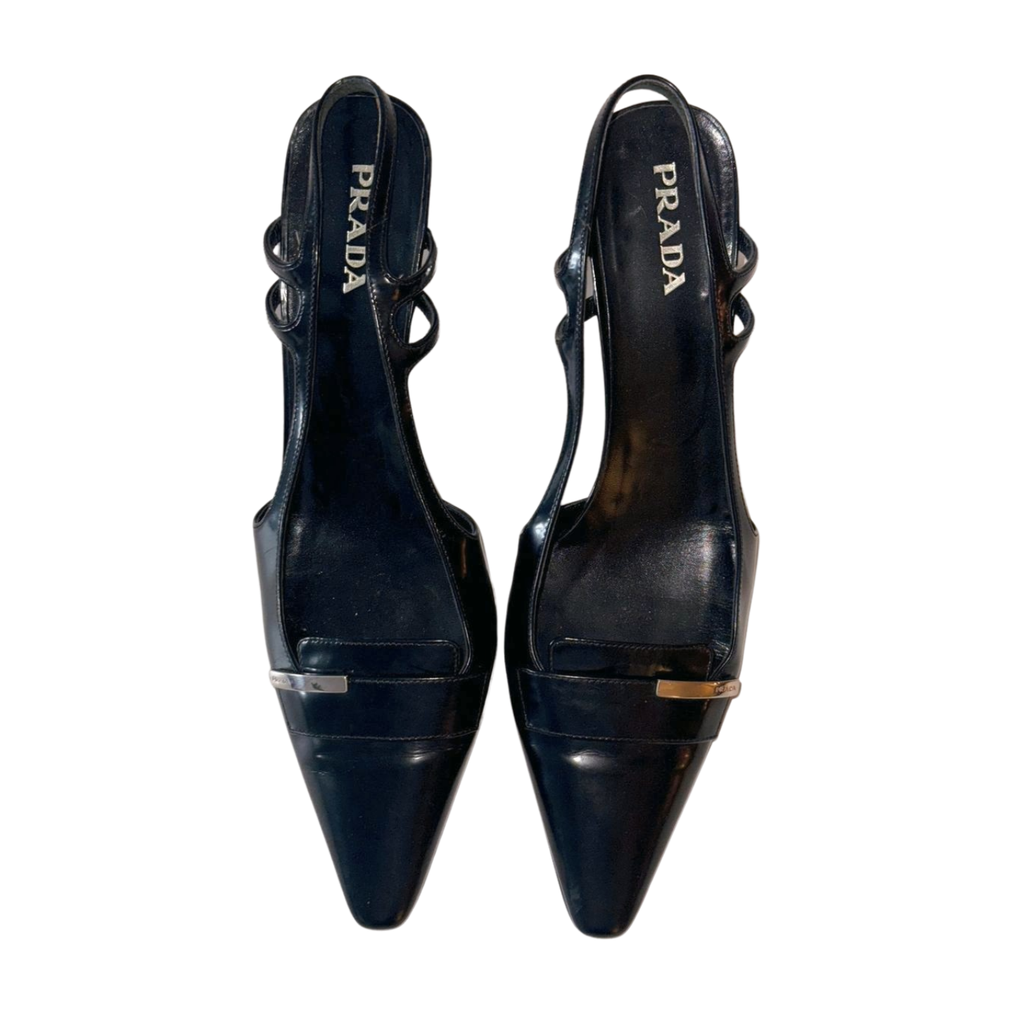 + Prada stilettos on 3 inch heel featuring strap detail at back and plated Prada logo.