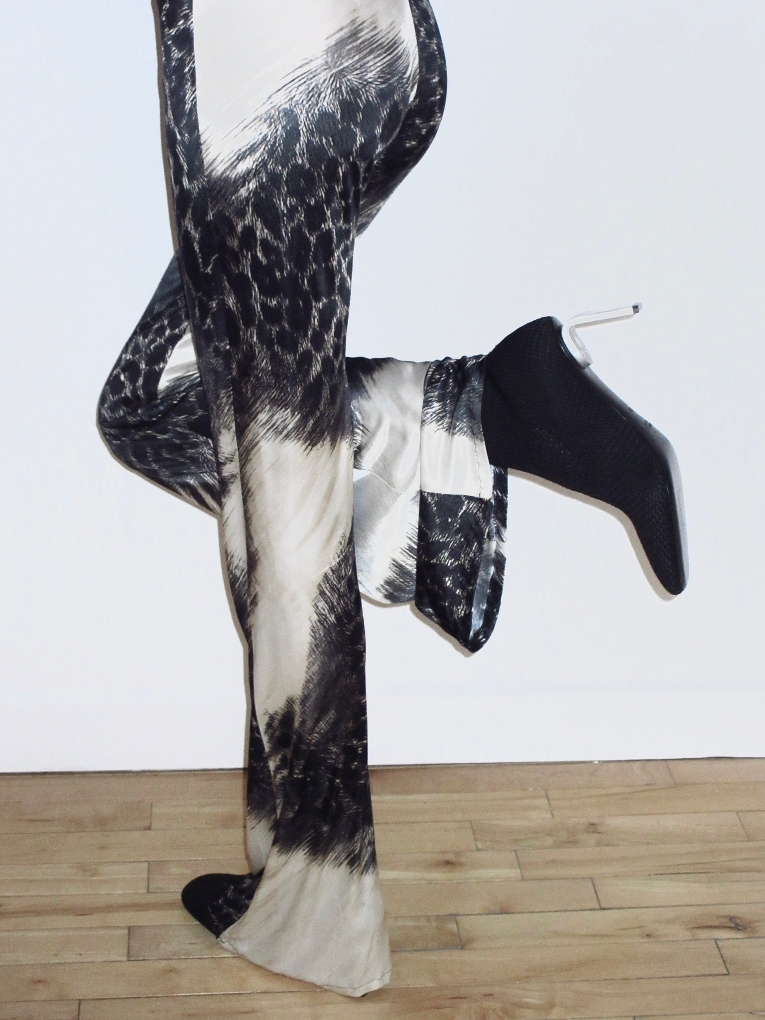 Crafted in Italy, these mid-rise pants from CLASS Roberto Cavalli feature a fluid stretch-jersey construction with a distinctive black and ivory abstract feather print. Designed with a fitted hip and dramatic flared leg, the piece captures Cavalli’s early-2000s approach to sensual tailoring through movement and print.
